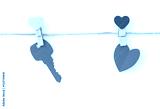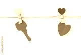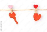 Red paper heart hanging on white background .