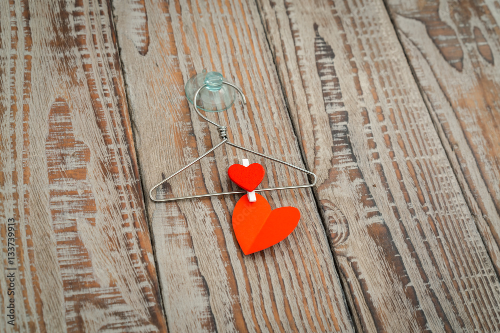 Red paper heart hanging on wood background .