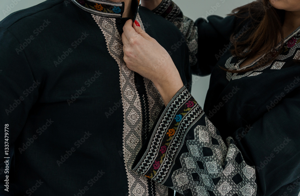 Close-up Detail of Female Hands Adjusting Traditional Colorful Embroidered Ethnic Clothing Sleeve Collar