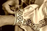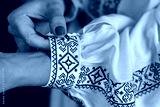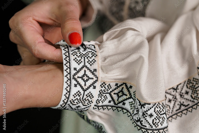 Close-up of Traditional White Clothing with Intricate Black Embroidery and Female Hand Fastening Sleeve Button