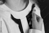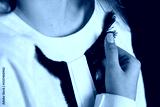 Close-Up of a Woman's Hand Touching Blue Fringed Embroidery on White Fabric
