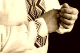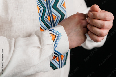 Close-up of Person Wearing Traditional Embroidered Linen Shirt with Colorful Geometric Patterns on Sleeves and Chest Against Dark Background