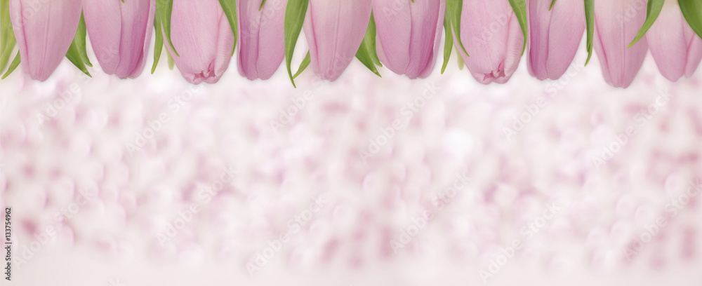 Valentines Day background with pink tulips. Bouquet of tulips with copy space. Tulips at border of image with copy space for text. Flowers on bokeh background.