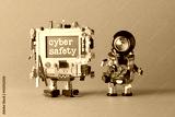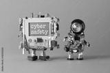 Cyber safety concept. System administrator robot and creative computer character with text message on blue desktop. Orange paper background