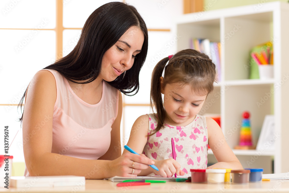 Happy family. Mother and kid daughter together paint. Woman helps to child girl.