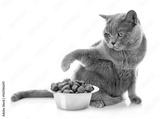 Cute cat and bowl with dry food on white background