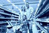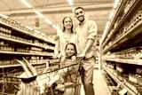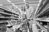 family with food in shopping cart at grocery store