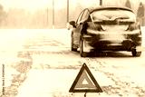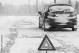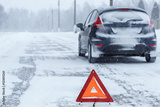Closeup of red warning triangle with a broken down car in winter