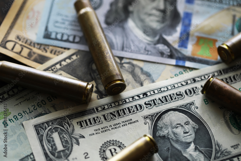 Illegal selling, criminal money concept, US dollars and bullet for a gun, cartridges on a background