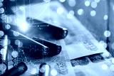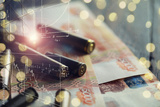 Cases of cartridges with ruble banknotes russians money with inscription five thousands rubles top view
