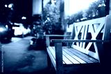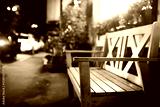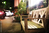 close up of green wooden bench in urban park during sunset time. Empty wooden bench in the city park