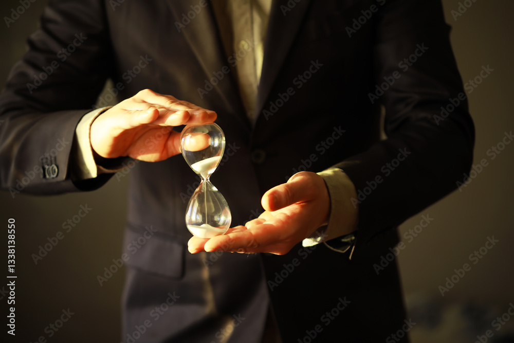 Businessman holding an hourglass isolated on dark background - time is money concept.