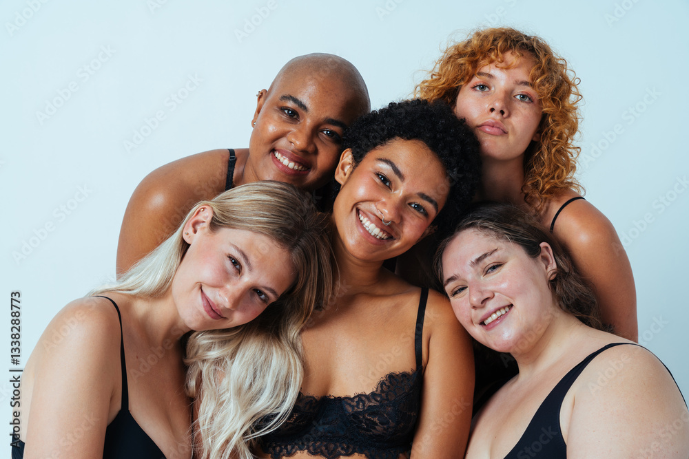 Multiethnic group of women wearing underwear with diverse kind of bodies, concepts about body positive, authentic people, diversity and body acceptance