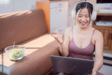 Smiling asian sportswoman wearing headphones and sportswear is making a video conference call with laptop while eating a healthy salad at home