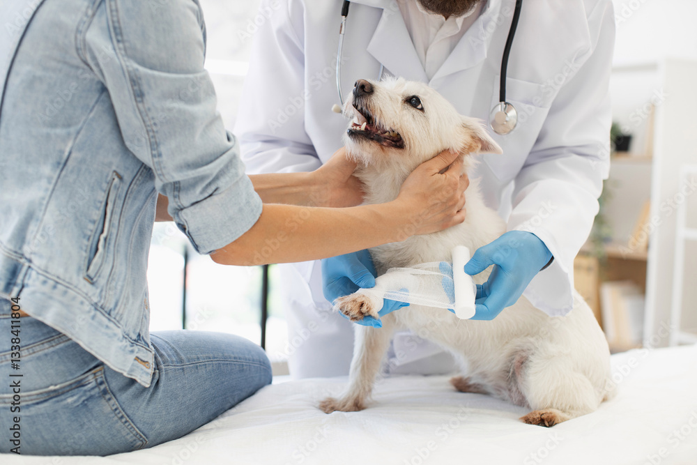 Veterinarian applying bandage to a small dog with injured leg while young woman helps. Depicts care, compassion, and pet treatment in a modern veterinary clinic