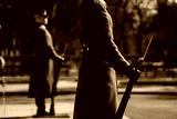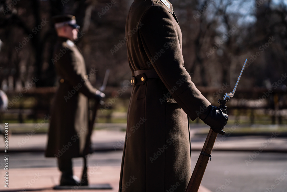 Freedom Monument Company of Guard of Honor military men standing in front of Freedom Monument with riffles close up in hands