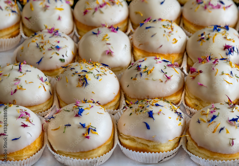 Fresh donuts at the bakery display for Hanukkah celebration. Selective focus.