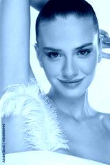 Smiling woman with arm raised, showcasing smooth underarm skin. Holding white feather near armpit. Natural makeup, hair in bun. Studio portrait on neutral background
