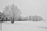 Zamarznięte jezioro z drzewami na brzegu.