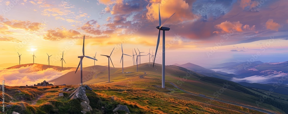 Panoramic view of wind farm set against dramatic sunset creates powerful image of renewable energy.