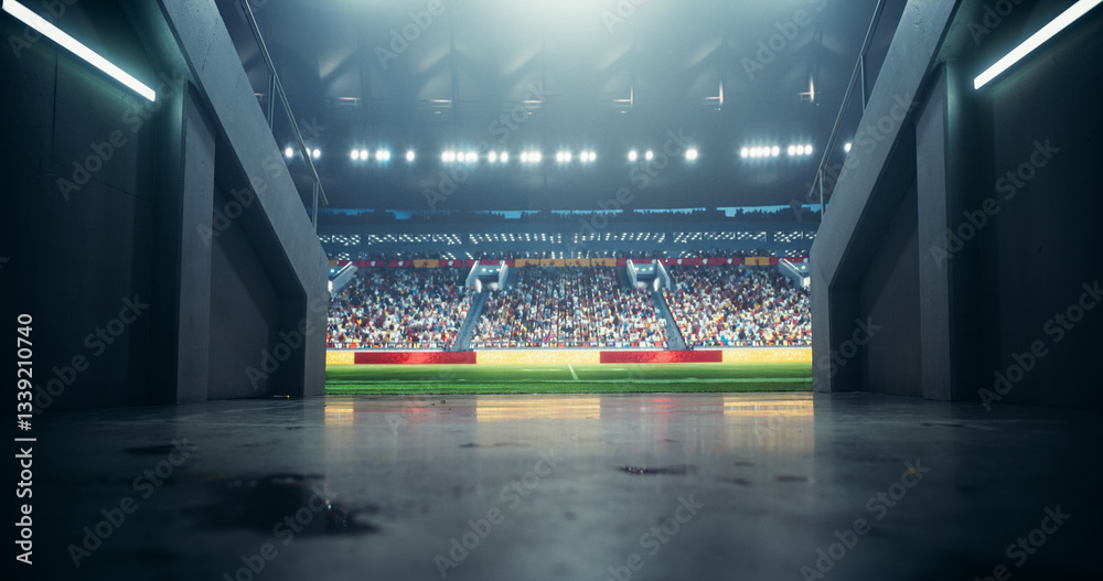 Photo Through a Tunnel Entrance to a Big Outdoors Stadium with Crowd Cheering and Awaiting for Favourite Teams to Walk Out And Play An Exciting Game. Stadium Filled with Energetic Sports Fans