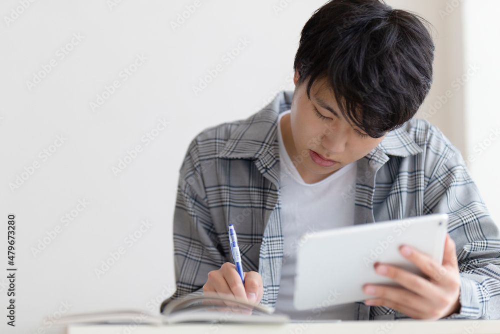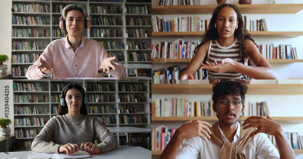 Split-screen collage four multiethnic students engaged in online class in library, talking, sit at desk, take part in remote virtual video call, learn, gain new knowledge. Group study, webinar, apps