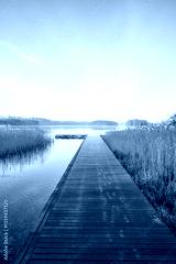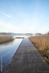 Wooden pier on Lake Barlinek, West Pomeranian Voivodeship, Poland.