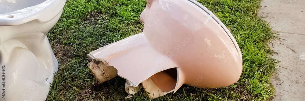 Broken toilet bowl on grass, recycling waste management, home renovation debris, environmental challenge