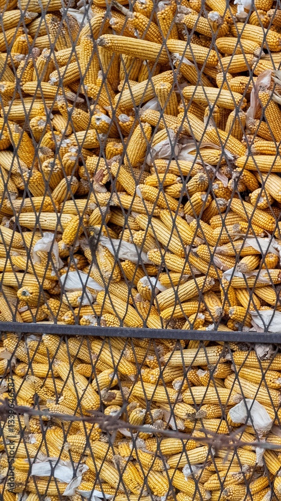 Dried corn cobs stacked in a metal cage, representing autumn harvest, agriculture, and sustainable farming