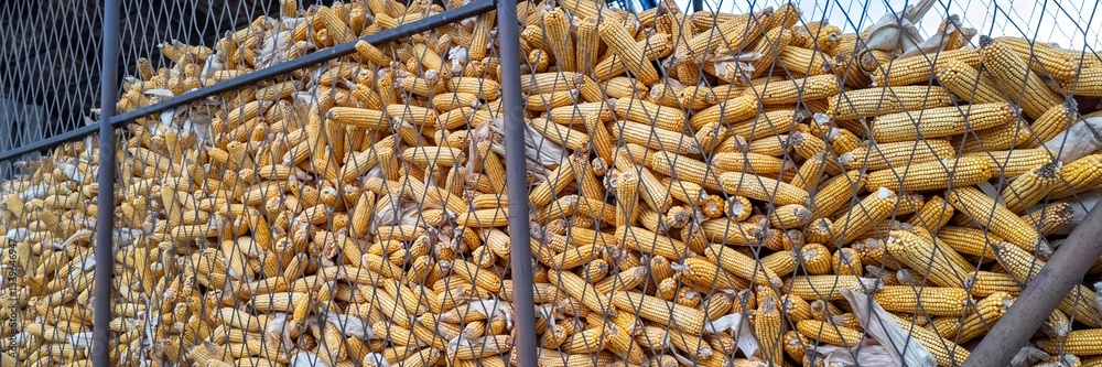 Stacked corn cobs behind metal mesh, abundant agricultural harvest, rural Thanksgiving, yellow maize