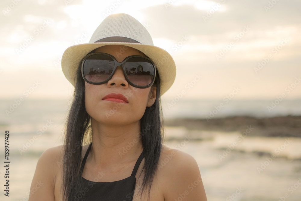 Sexy woman with black dress posing on the beach