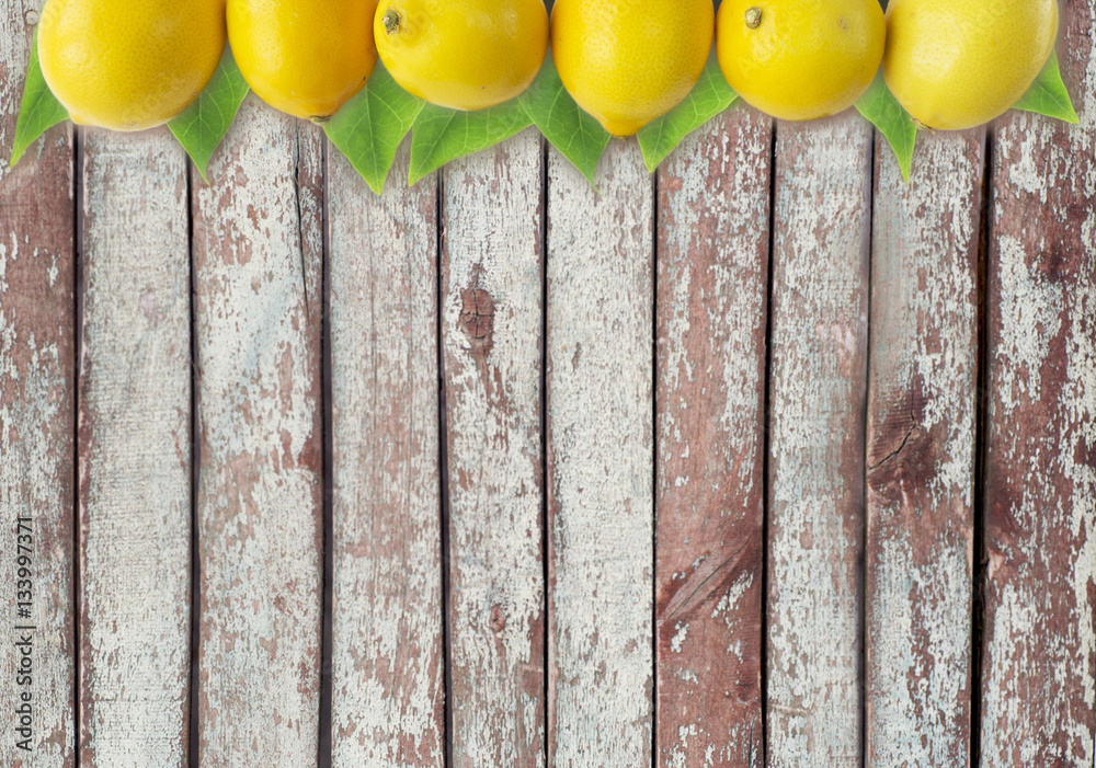 Lemons at border of image with copy space for text. Top view. Ripe lemons close-up on a wooden background. Background citrus.