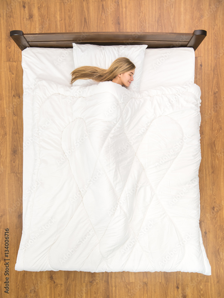 The happy woman sleeping on the bed. View from above
