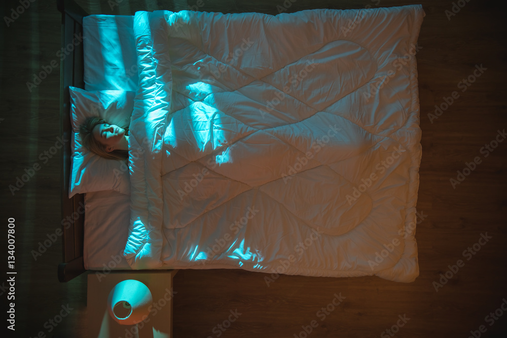 The cute woman sleeping on the bed. Evening night time. View from above