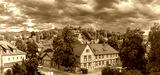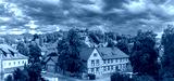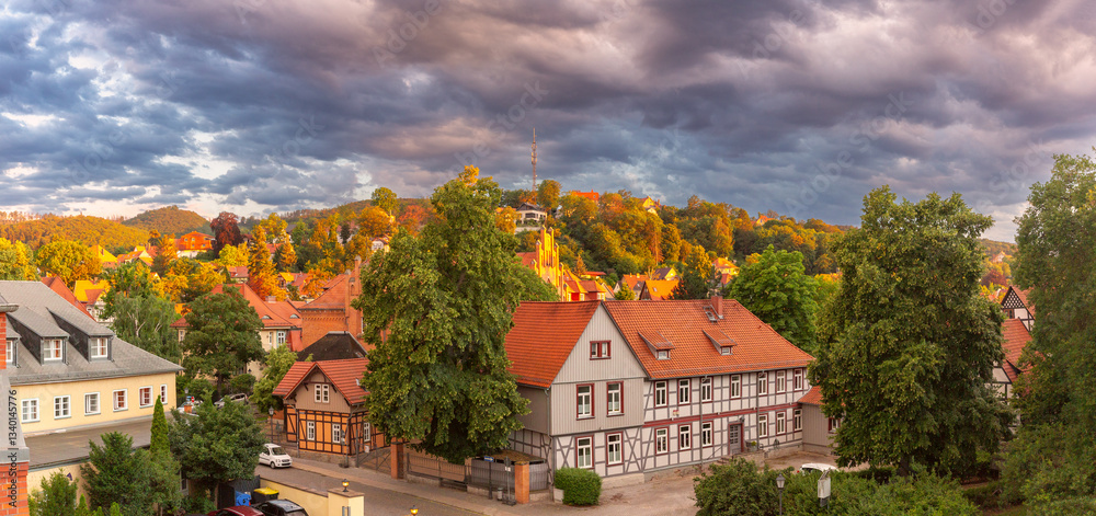 A panoramic view of Wernigerode, Germany, with half-timbered houses, lush greenery, and rolling hills in the background