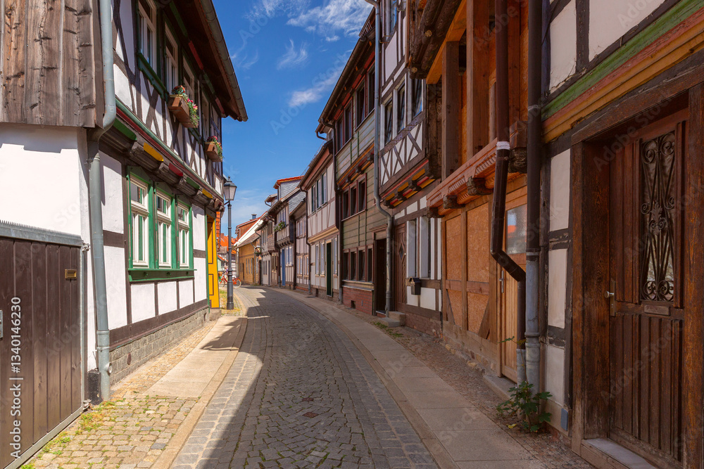 A narrow cobblestone street lined with historic half-timbered houses in Wernigerode, Germany