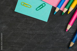 School supplies border on black chalkboard background. Top view product photograph with copy space for text or design. Back to school, education concept