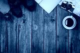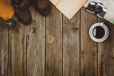 Accessories for travel top view on wooden background with copy space. Adventure and wanderlust concept image with travel accessories. Preparing for an exotic trip, journey and sightseeing.
