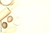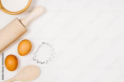 Baking a cake or pizza ingredients background. Top view photograph with kitchen utensils on vintage, natural, white, wooden background.