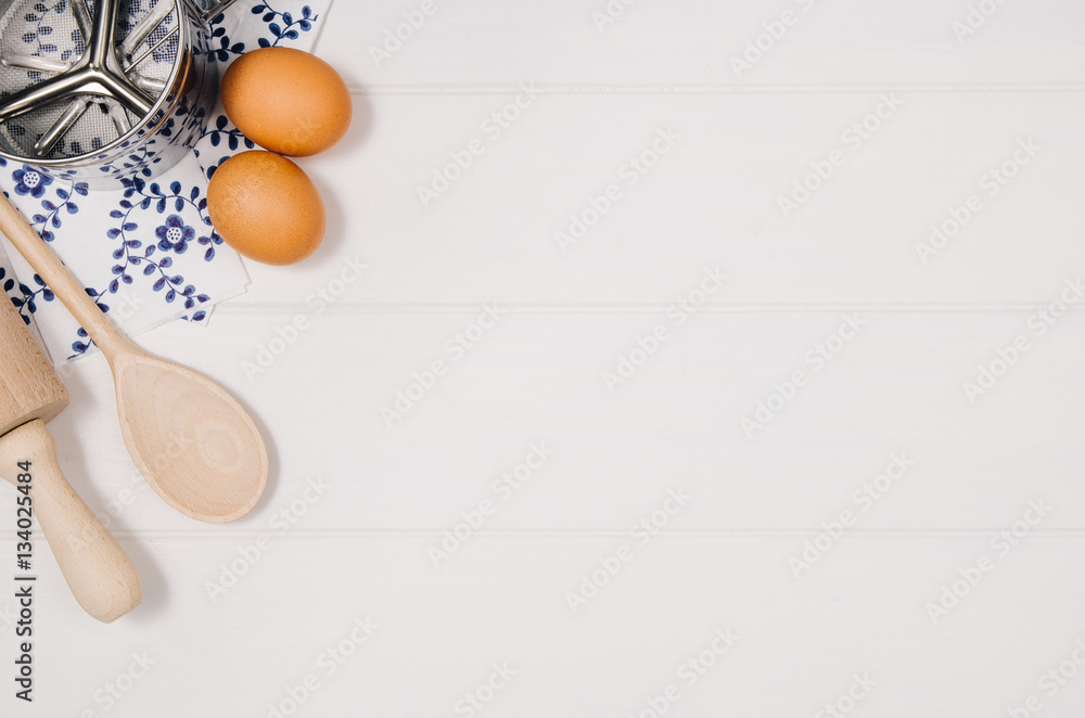 Baking a cake or pizza ingredients background. Top view photograph with kitchen utensils on vintage, natural, white, wooden background.