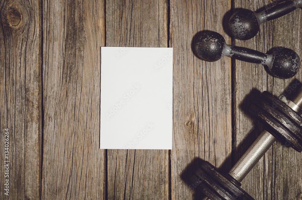 Fitness training plan of personal trainer with old iron dumbbells or exercise weights outdoor on an old wooden deck, floor or table in the gym. Image frame taken from above, top view.