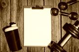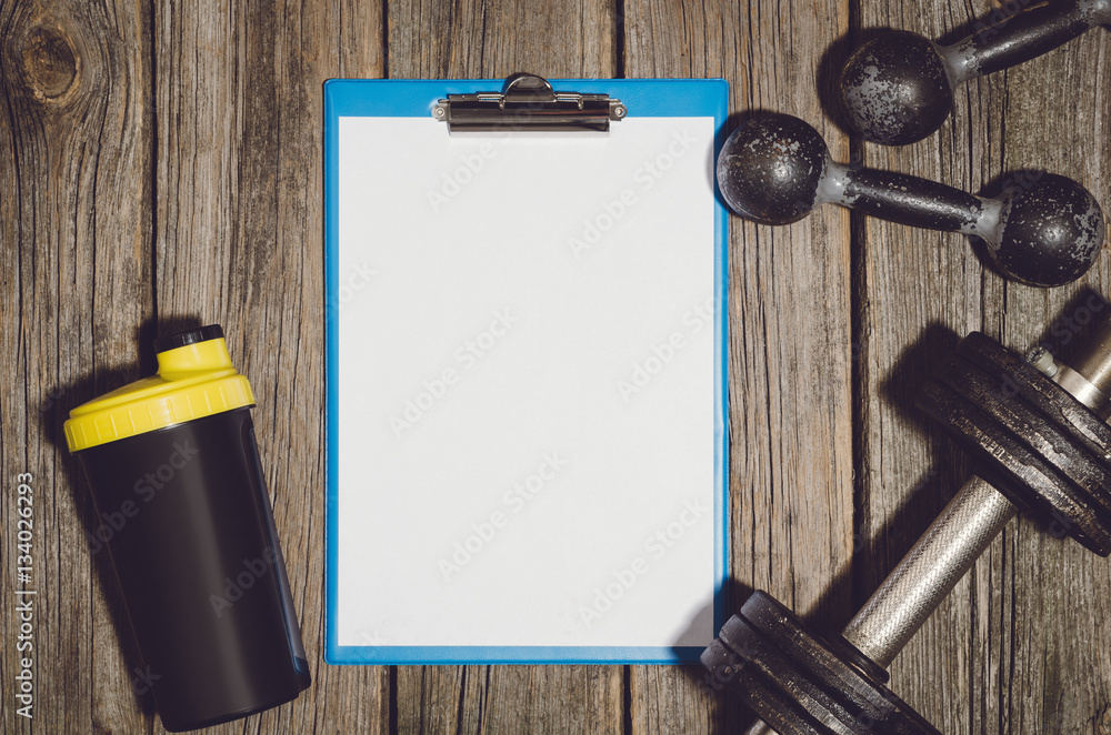 Fitness training plan of personal trainer with old iron dumbbells or exercise weights outdoor on an old wooden deck, floor or table in the gym. Image frame taken from above, top view.