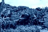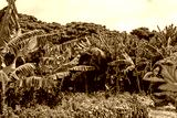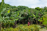 A lush growth of green leaves of banana trees outdoor at daytime outdoor in a garden on tropical Taketomi island in Okinawa Prefecture in Japan with space for text.