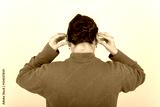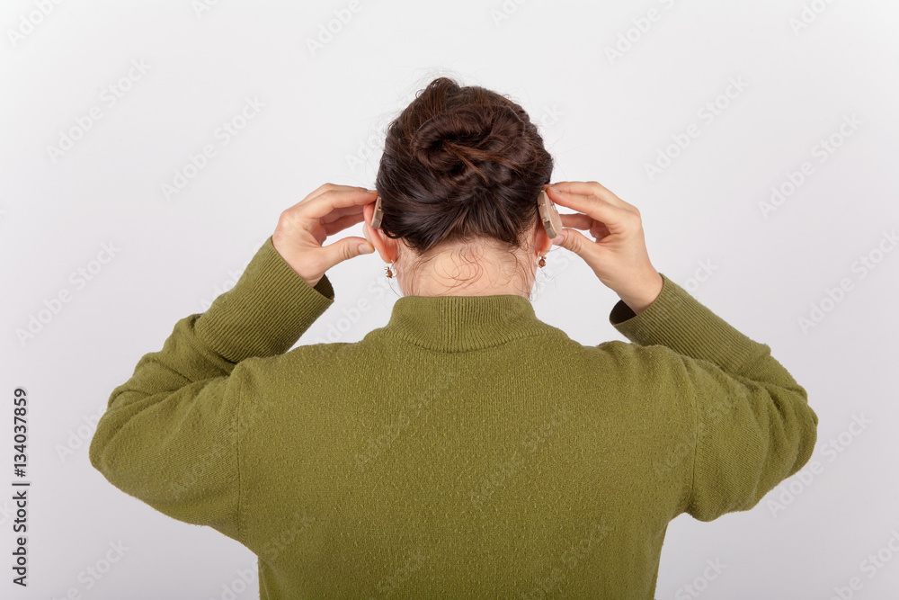 Woman putting on hearing aids