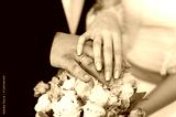 Hands of newlyweds with rings on unusual wedding bouquet.