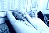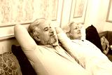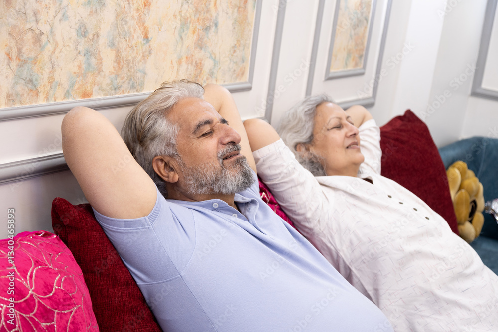 happy elderly indian couple relaxing on the couch at home spending quality time together. retirement life