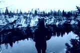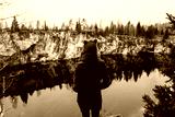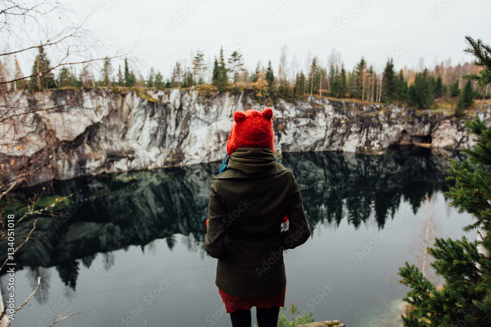 Pretty nice girl enjoy beautiful lake view from the hilltopl and good weather in Karelia. Around the rocks.