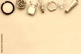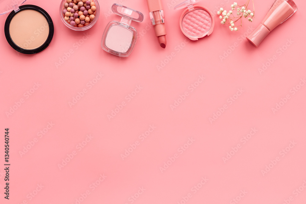 Makeup accessories - brushes and pink pastel cosmetic products, flat lay, top view