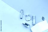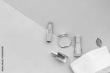 Layout of cosmetic bag with makeup brown pink shade beauty products, top view