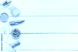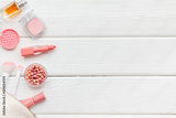 Layout of cosmetic bag with makeup brown pink shade beauty products, top view